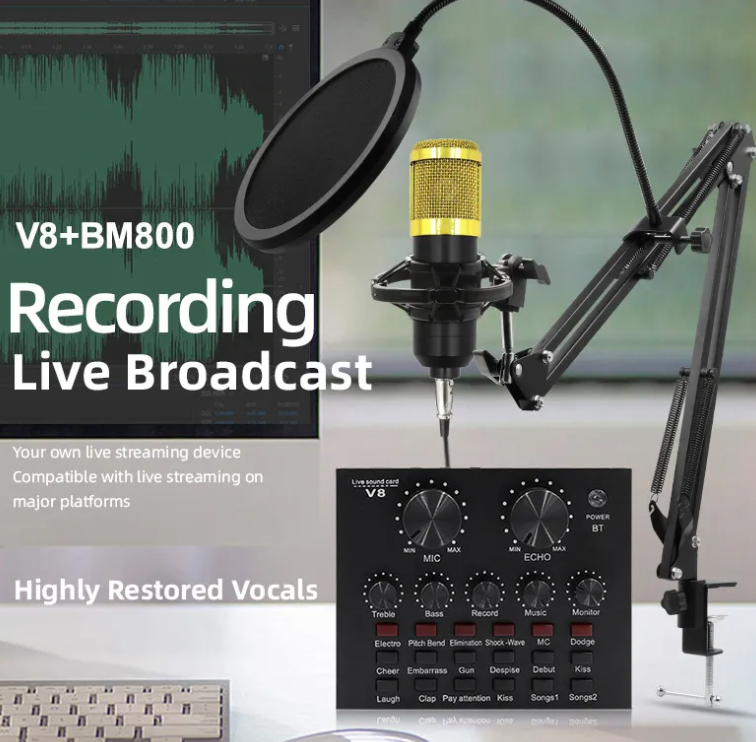 1.Paquete de equipos de podcast profesional El paquete de equipos de podcast está equipado con micrófono BM-800, soporte de choque, filtro pop, soporte de brazo de tijera de suspensión ajustable para micrófono, tapa de espuma antiviento, cable de alimentación, tarjeta de sonido en vivo. Este equipo de estudio profesional fue diseñado para podcasting, transmitir y grabar música y videos cortos. 2.Excelente calidad de sonido El paquete de micrófonos de condensador ha sido diseñado con un chipset de sonido profesional 2023, que permite que el micrófono mantenga una frecuencia de muestreo de 120 kHz y una tasa de bits de 24 bits, asegurando que tu voz sea capturada con alto detalle. El patrón de recogida cardioide ofrece una captura impecable y precisa, que es más adecuado para grabar podcasts, voces y otros trabajos de voz. 3.Alta compatibilidad El paquete de equipos de podcast no solo es totalmente compatible con la mayoría de los sistemas operativos convencionales como Windows y Mac OS, sino que también es compatible con teléfonos inteligentes (Android e IOS), incluso se conecta a dos teléfonos móviles para transmitir en vivo en ambas plataformas de transmisión al mismo tiempo. Cumple con el uso de todos los escenarios: juegos, transmisión en vivo, podcasting, voz en off, grabación de música, en vivo y cantar, tomar video en TikTok, YouTube, etc. 4.Plug and Play, fácil de usar Esta tarjeta de sonido en vivo con múltiples efectos de sonido se puede utilizar en cualquier teléfono celular, computadora y cualquier plataforma de juego. No necesita software de driver adicional.